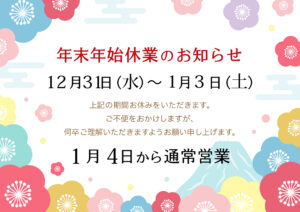 年末年始の営業について2025-2026 2025.12.23Blog 年末年始の営業は下記の通りです。 12/31日(水)、1/3日(土)は楽天ビューティーにて一部予約を開けておりますが、予約状況により休業となりますことをご了承ください。 Post Share Hatena Pocket RSS feedly Pin it 投稿者: priderockhairBlogコメント: 0 2025年年末のご予約について